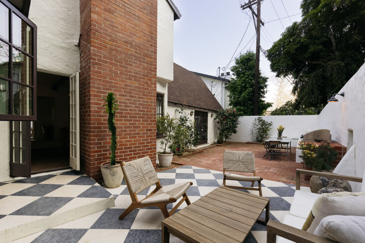 Above: The kitchen’s checkerboard floor (from local supplier Emser Tile) flows out to the enclosed patio:”They’re 12-by-12 squares; we considered porcelain but fell in love with natural marble. It will weather over time,” says Rudolph.