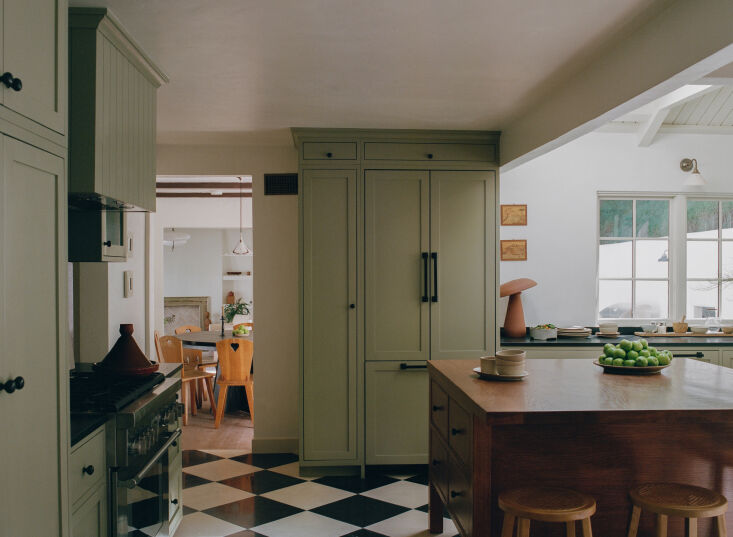 Above: In place of what had a been a galley kitchen with a laundry squeezed in and small breakfast room, Kutner and Rudolph envisioned an English take on a modern Tudor kitchen and fully opened up the space. Their custom oak island was designed to look old. The narrow storage over the fridge is “where you can put your prenup,” says Kutner.