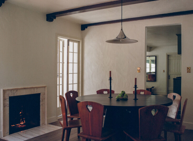 Above: The dining room has the second of five fireplaces, most of which work (this one has a gas insert). A Gubi Semi Pendant hangs over a round table surrounded by 1960s French pine chairs that the designers bought at a Billings auction in downtown LA. The brass dimmer switches throughout are from Forbes & Lomax.