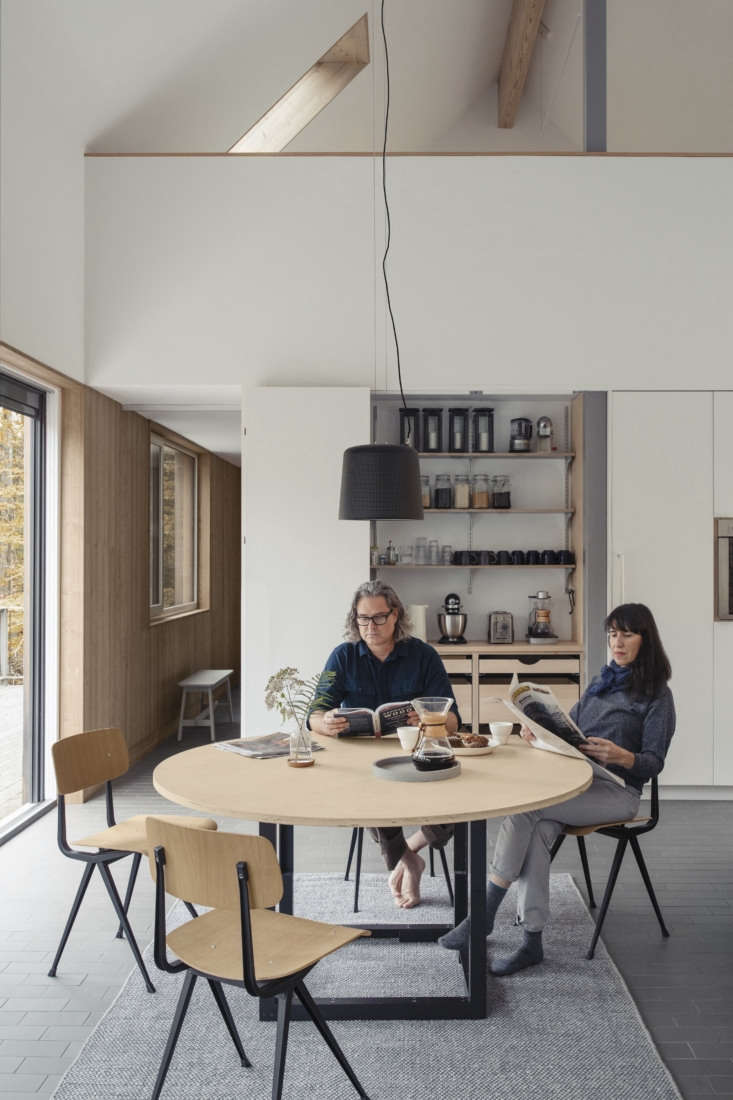 Above: Todd and Maria designed and built their kitchen table: it’s composed of furniture-grade birch plywood bolted to an anodized aluminum base assembled from parts they had in their office. In addition to using their own designs and Vipp’s expanding line (including this gray Wool Rug), the couple gravitated to furniture by Hay: the Danish studio’s Result Chairs are shown here in oak.