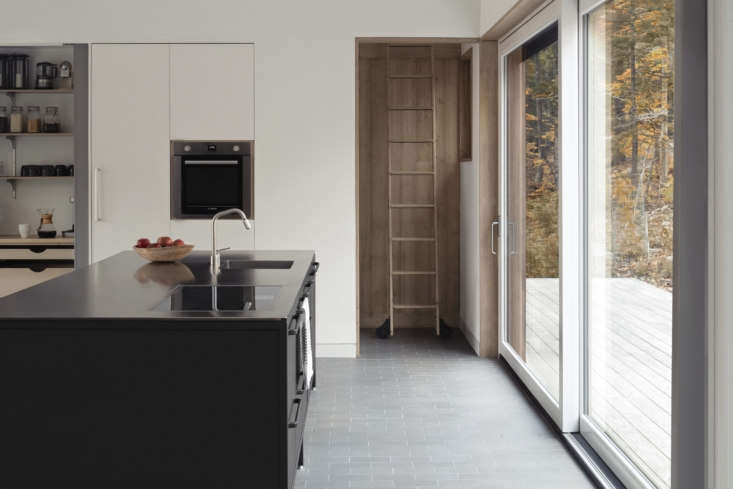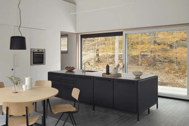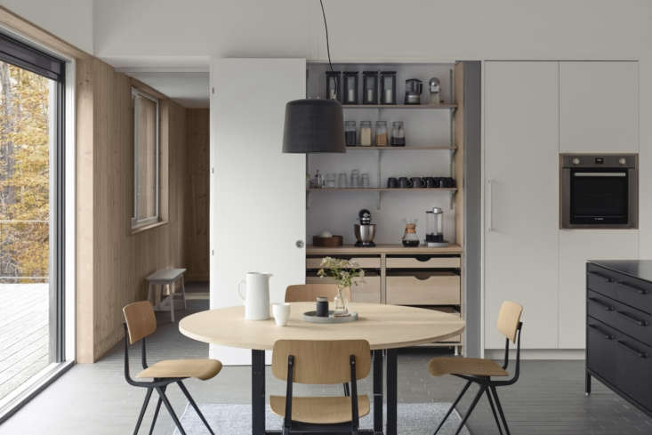 The aluminum-framed, thermally insulated glass doors are 8 by 8 feet—”the maximum size for a lift and slide door,” says Maria—and, like the triple-glazed windows, were supplied by Schüco. This one, on the north end of the house, opens to the kitchen, outfitted with a freestanding island made by Vipp of Denmark. That’s also the iconic Vipp Pedal Bin in the foreground (we singled it out in Remodelista, A Manual for the Considered Home in our roundup of 100 favorite everyday objects).