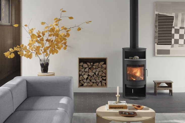 Above: A Rondo stove by Rais supplements sub-floor radiant heating. (The niche is filled with logs from the cleared trees on the property.) “Our goal is to be as close to net zero as possible,” says Todd. “Right now, only our boiler draws power from the electrical grid, and that’s between November and April.”