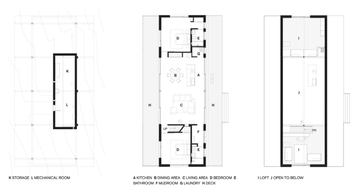 Above: The floor plans detail the basement mechanical room, the longhouse layout of the main floor, and the two lofts (the one on the north end has an en suite bath).