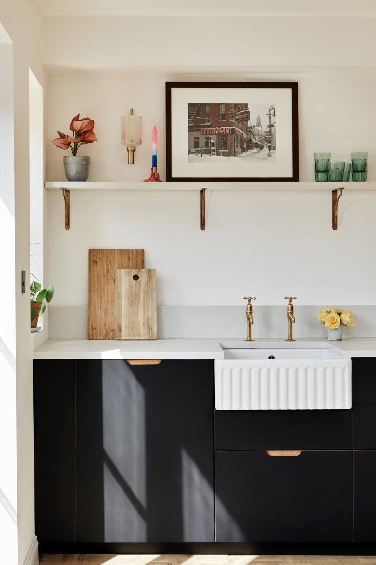 Above: Lena and Scott bought their fluted sink at Insitu, an architectural salvage yard in Manchester, and paired it with old brass taps from Taps Refurbishment: “Yes, cold and hot separate taps,” specifies Lena. “We really like simplicity in the kitchen: we don’t have a microwave or many mod cons.”