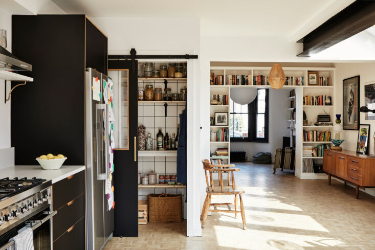 Above: To close off the pantry, Hølte designed and fabricated a sliding door inset with reeded glass.,