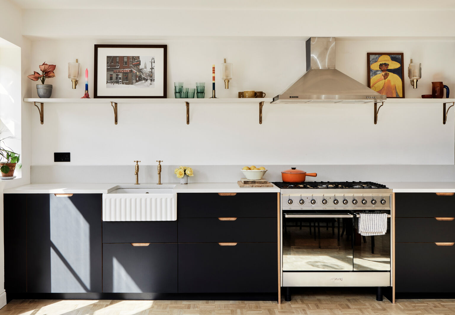 “The design of the space centered around two things: a three-meter-long table [made by Lena and Scott’s friend Will Elsworthy] and dark cabinets,” reports Dan Robbins, the Hølte lead designer on the project. The latter were inspired by Ally Capellino designer Alison Lloyd’s kitchen as admired in The Modern House Journal. “I had an old Terence Conran book that I also looked at a lot when choosing elements,” says Lena. And the idea to frame the kitchen window in yellow? That came from memories of visiting filmmaker Derek Jarman’s celebrated dark cottage in Kent: “The yellow offers an optimistic touch—and keeps the black from looking too clinical,” says Lena.