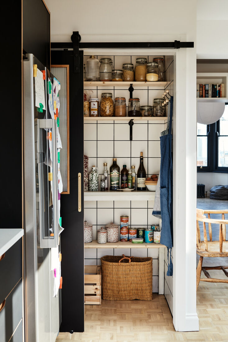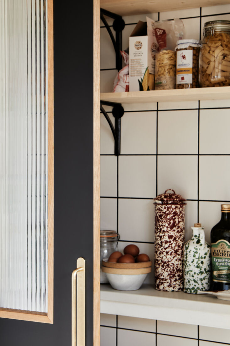 Above: Tiling the pantry in affordable, standard-issue white tiles set off with black grout was, Lena tells us, “mainly for practicality—we wanted to keep it clean. We used dark grout a lot in the house and like the impact.”