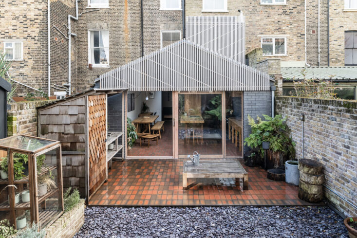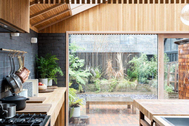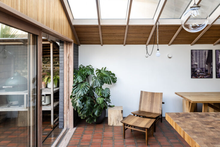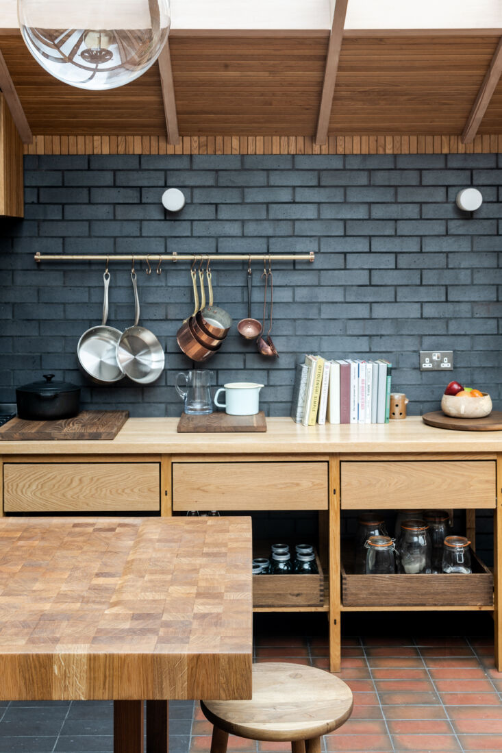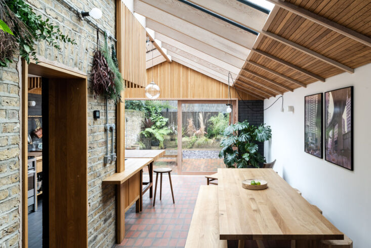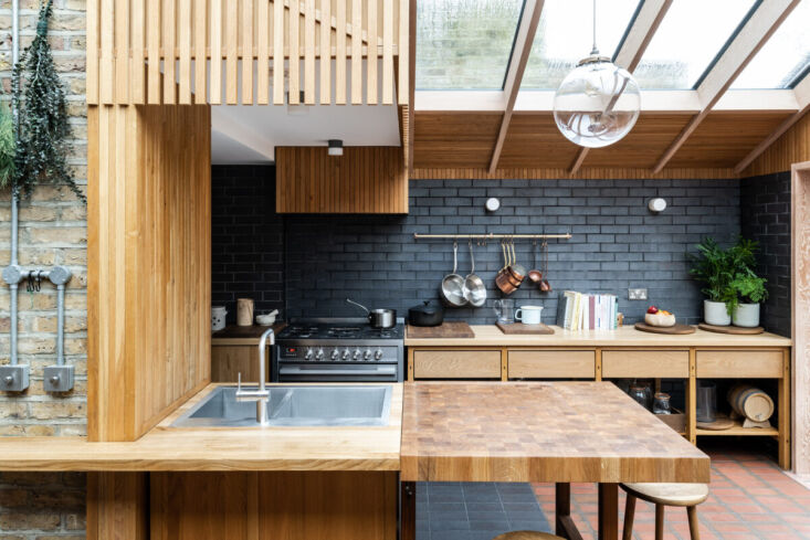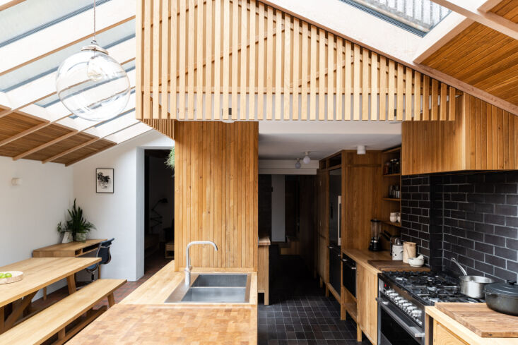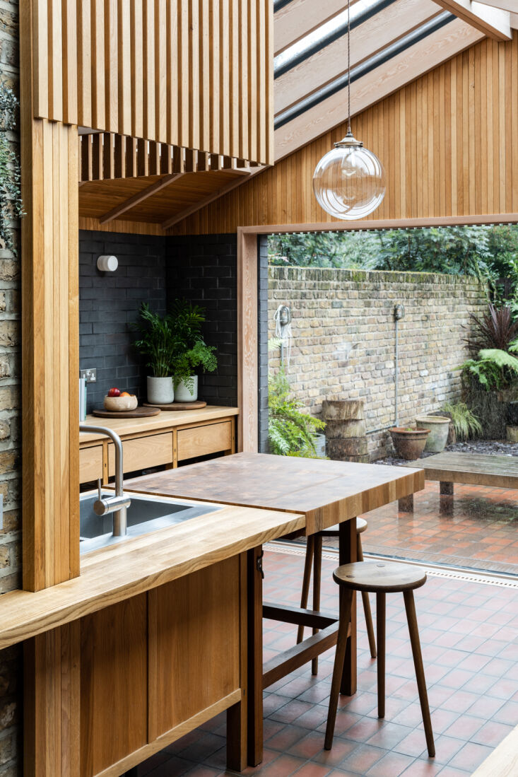 Daniel, a trained architect and masterful woodworker, was brought on to design a rear extension to house the eat-in kitchen. Everything in this space that’s made of wood—countertops, furniture, and architectural details like louvres—is his handiwork, much of it fabricated in his garden workshop. “I’m a product of growing up around tools and watching [my dad] make things,” he told The Modern House, which is where we first stumbled upon this project (the home is currently listed for £1,350,000).