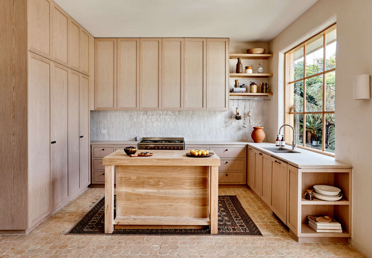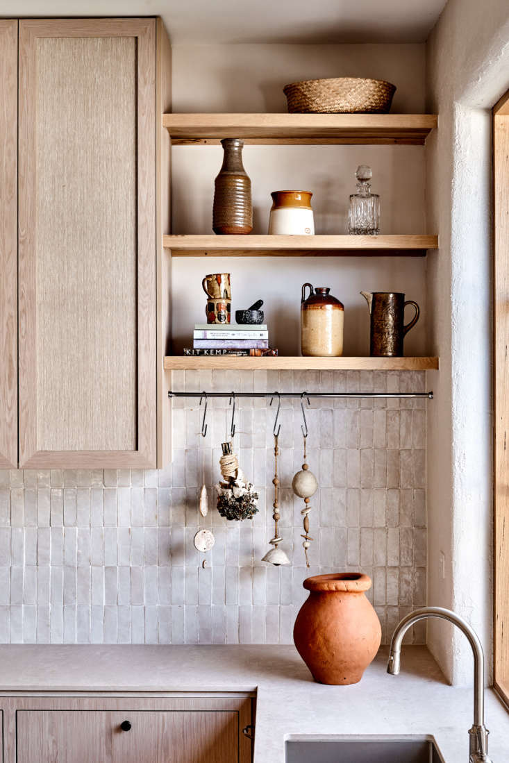 The historic structure had been lovingly maintained but untouched for decades and Georgia was excited to usher the interior into the 21st century, especially the kitchen. Taking inspiration from her travels, she introduced a pale timber and tiled design that’s both tailored and rustic, simple and carefully detailed: “My look is bohemian and natural. I’m deeply inspired by Morocco and Spain not only for their aesthetics but cultures, too,” she tells us. Her work, she adds, is also practical, noting that she did not stint on storage—overhead cabinets, this could be your comeback. Every element was custom made and selected with longevity in mind.