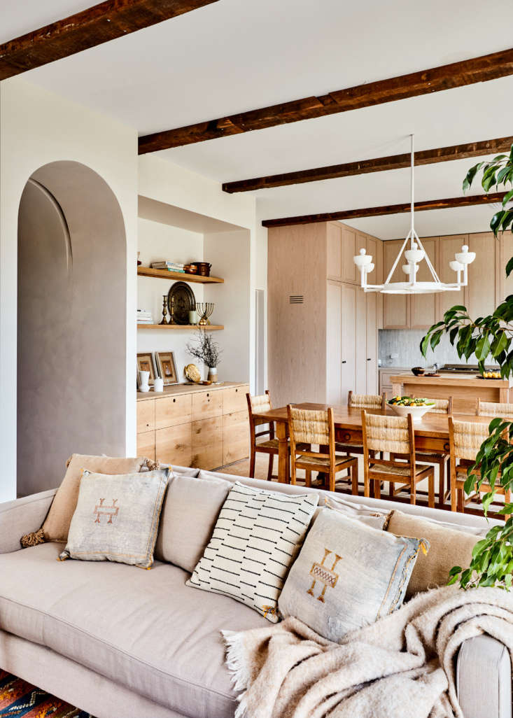 Above: Many walls were removed over the course of this remodel: the kitchen is wide open to the living-dining area. Georgia designed the plasterwork light over the table—she has a line of plaster lights coming next year. The archway is one of several she introduced to the house: “When we first put this one in, it looked like a Conehead,” she says. “I may have made James, our builder, rip it out twice. Let’s just say being a perfectionist comes with baggage.”