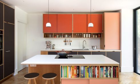 Above: In the middle of the first floor is the kitchen, with cabinets by Reform. The Ginger Pendant by Joan Gaspar for Marset floats above the island.,