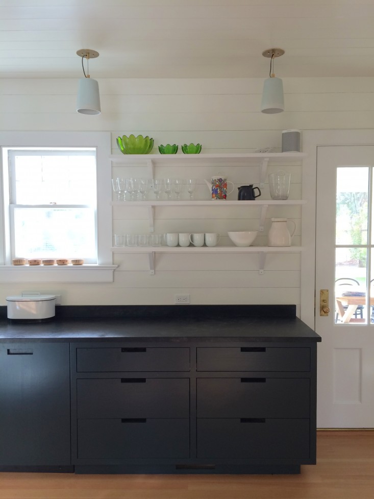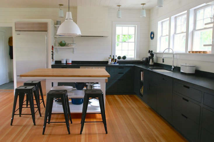 Above: The countertop is Alberene soapstone, which Lisa bought directly from a quarry in Alberene, Virginia. “Sourcing the slabs from images at a distance was difficult, but I persisted because of the large cost saving,” she says. “The slabs were shipped to a local fabricator, and I worked with him on setting up the patterning and seams. I love the waxy, warm feel of the stone, and this particular soapstone has a slight veining that adds depth and character without becoming too much of a pattern.” Later today, see our Remodeling 101 primer on soapstone countertops.