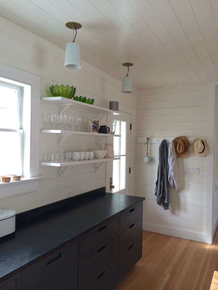 Above: The Goodes incorporated shiplap paneling on the walls to match the vernacular of historic houses in the area. The walls and ceiling are painted in White Dove by Benjamin Moore. Learn more about interior shingles in Expert Advice: The Enduring Appeal of Shiplap.