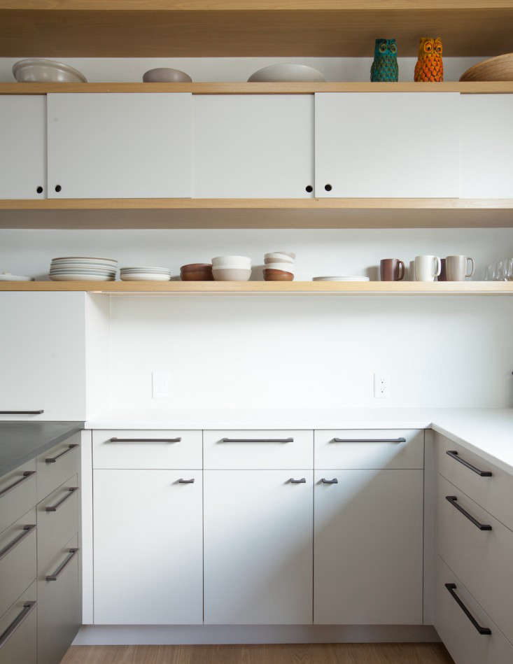 Above: In an all-white Bay Area kitchen, Medium Plenty designed a wall-mounted, white oak cabinet with sliding MDF doors and circular cutouts—a midcentury design reference to the credenzas of George Nelson. (See the rest in Kitchen of the Week: Oakland Family Kitchen by Medium Plenty.) Photograph by Melissa Kaseman, courtesy of Medium Plenty.
