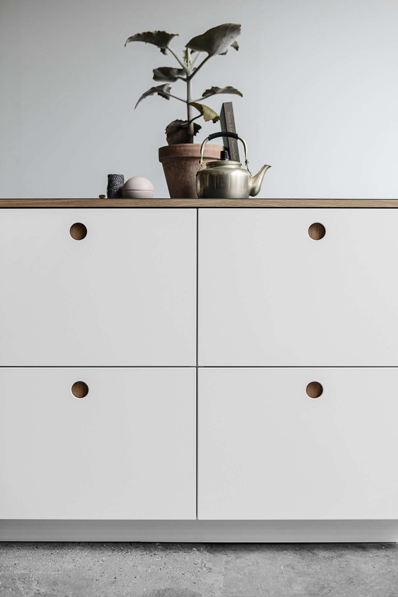 Above: Another twist on the concept: Here, spray-painted MDF cabinet fronts have circular cutout pulls backed by natural or smoked oak wood. The doors, by Danish company Reform, are meant to be attached to Ikea cabinet boxes. (See more in Kitchen of the Week: A Sixties-Inspired Danish Ikea Hack, Now Coming to America.)
