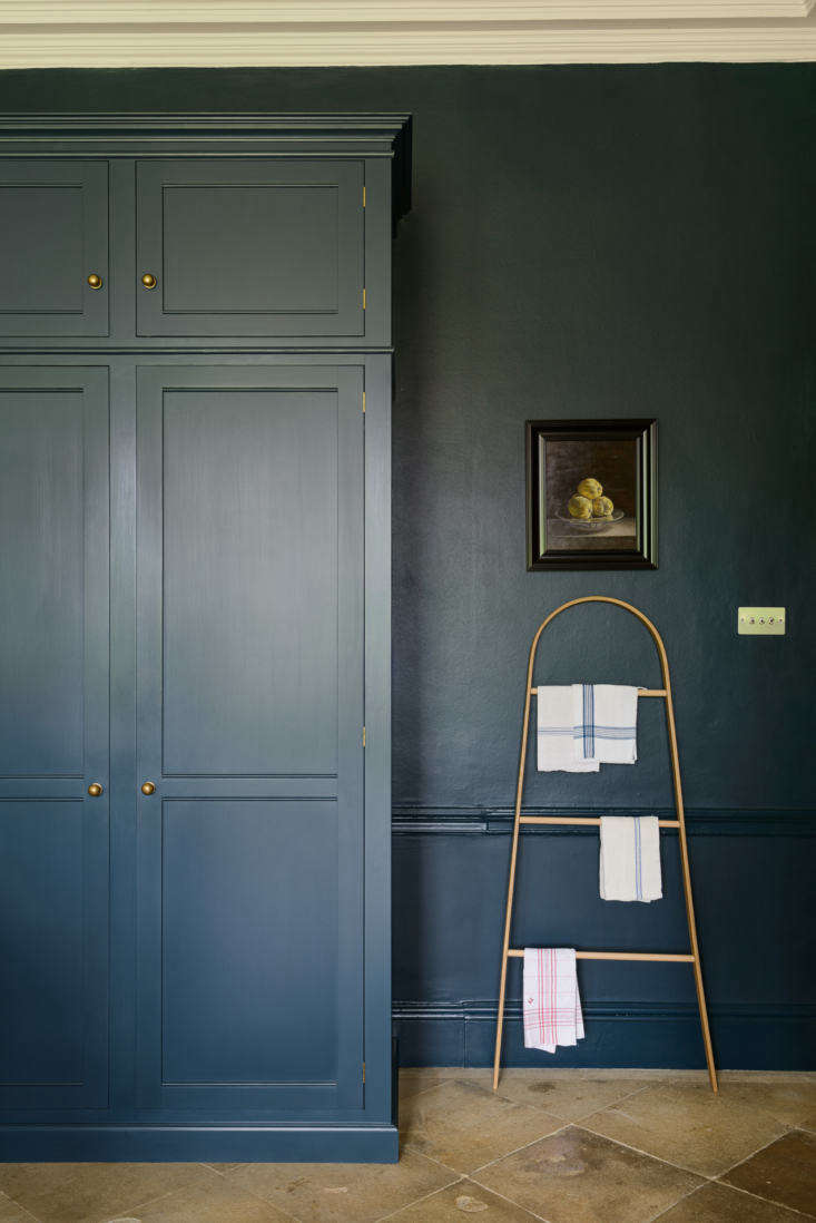 Above: The wall of cabinets ends with high cabinet doors that conceal the refrigerator and pantry. Kitchen linens hang from the Taffrail rack by Tom Raffield.