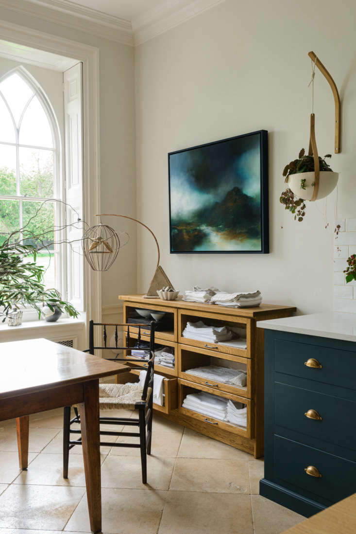 Above: The glass sideboard, for storing kitchen linens, is from deVOL’s Haberdasher’s Kitchen series. The Morvah Hanging Planters are by Tom Raffield.