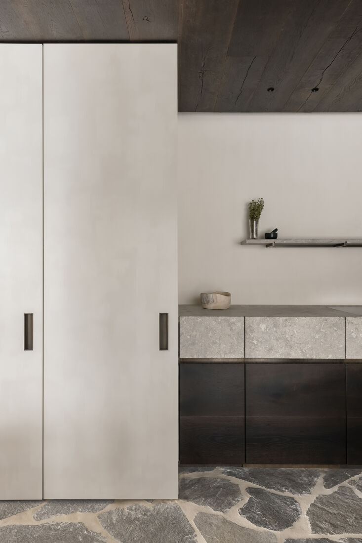 Above: The fridge, stove, and coffee equipment are tucked behind the cabinets to the left of the kitchen counter. The door pulls and cabinet detailing are untreated bronze.