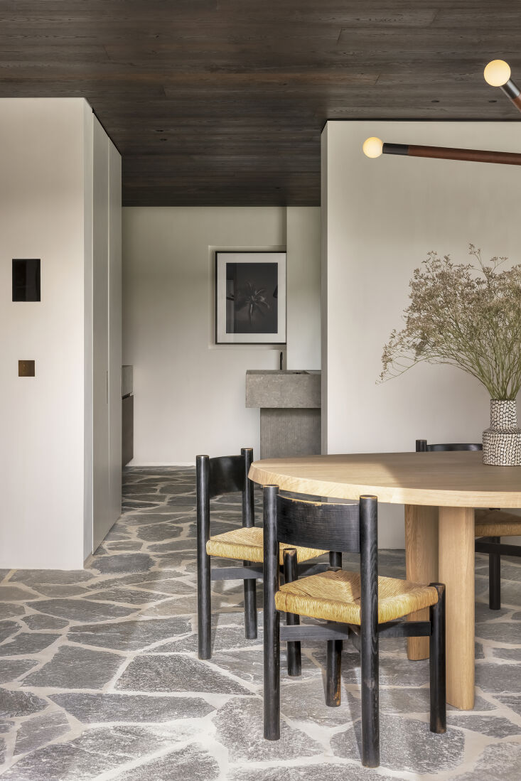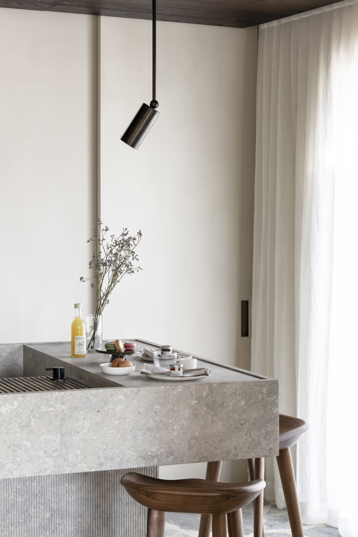 The villa is known as the MUD Residence, a reference, explains Sophie, to the fact that the spaces can be “shaped however you like” and also to the choice of flagstones, fumed oak, and other elemental finishes. We’re especially drawn to the kitchen and its island of cantilevered limestone blocks. Take a look and see what you think.