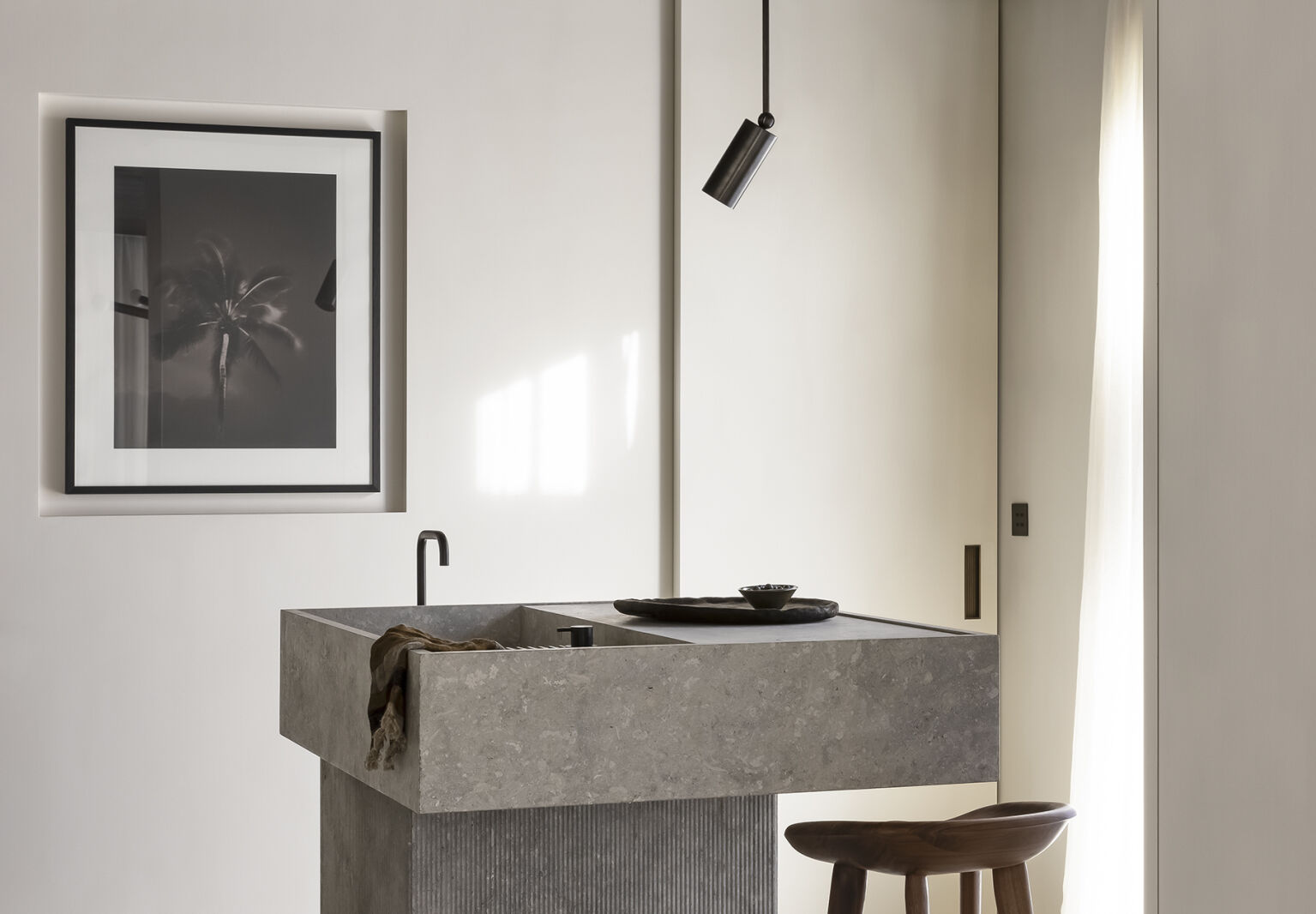 Above: The sink is incorporated into the sculptural limestone island with a finely etched base: see our Trend Alert: Fluting in the Kitchen. “MUD,” says Sophie, “is intended to be a source of inspiration for its residents.” Note the black-and-white photograph by the Douglas Brothers inset in a niche.