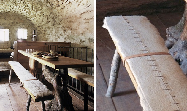 Above: Simple handmade wood furnishings and horsehair cushions that double as beds at night.