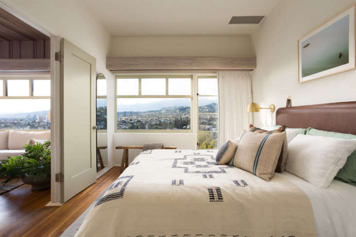 Above: The small bedroom features linen bedding by Five/Six Textiles, a custom leather-wrapped headboard, and views of Los Feliz. Photograph by Virtually Here Studios.