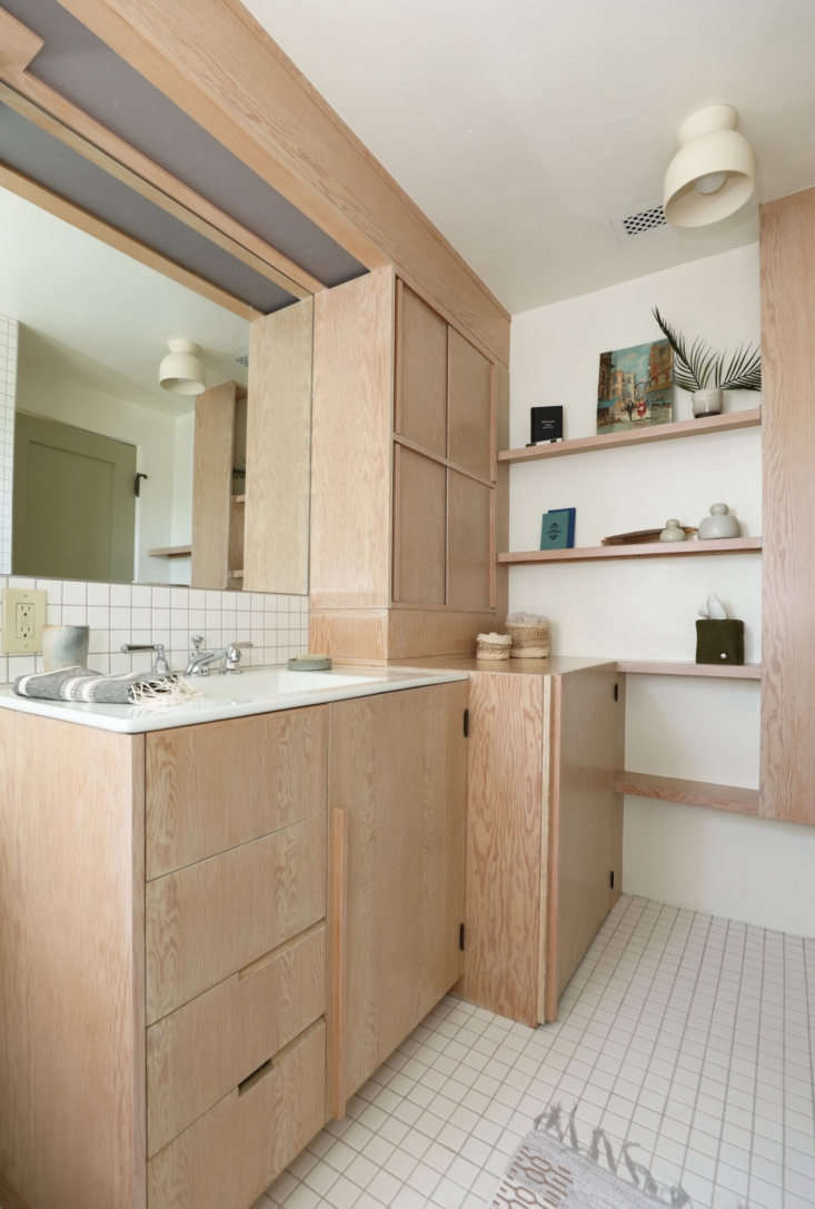 Above: Luis Guerra Woodworking made all the cabinets in the kitchen and bath. A dual washer/dryer unit is concealed behind the deep cabinet. The Terra Surface Ceiling Light is by Cedar and Moss.