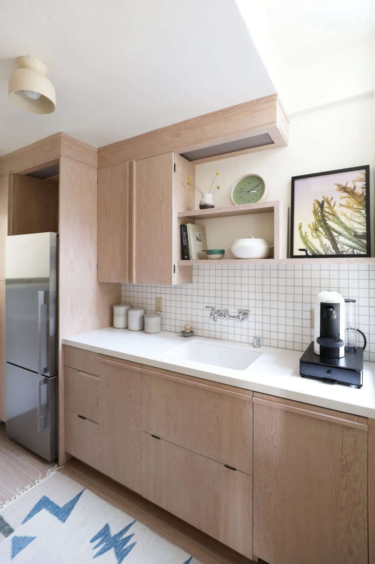 Above: All the cabinetry and built-in shelving throughout the unit were based on designs in the original apartments. (See 10 Easy Pieces: Wall-Mounted Industrial Faucets for similar faucets.)