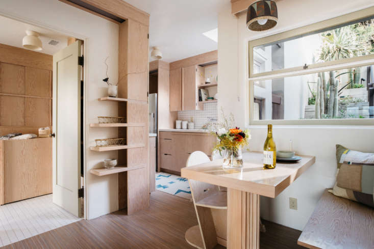 Above: Luis Guerra Woodworking custom-made the breakfast nook, including the bench and pedestal table (which took two days to fabricate). “The two chairs are are re-creations of chairs that Schindler designed for the property, which sold for $10,000 each. The seat was widened and the slant of the back support was changed slightly to make the chairs more comfortable,” shares Finegold.