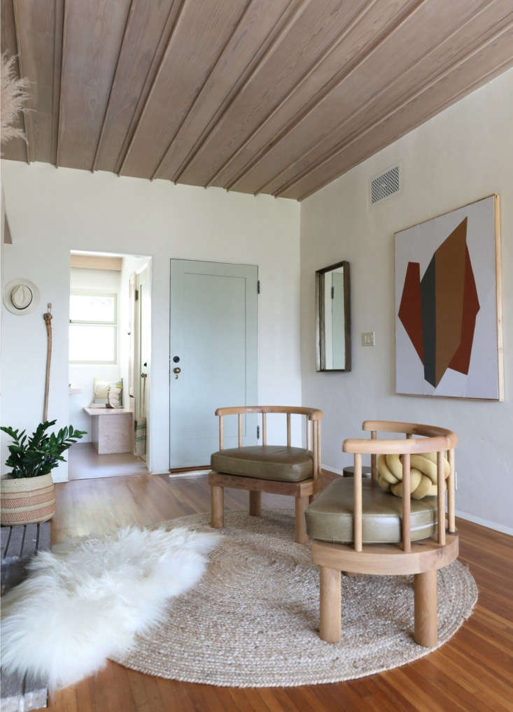 Above: The white oak floors are original to the home. The ceiling is clad in cathedral plywood sourced from a small lumber mill in Portland, Oregon. “Cathedral plywood has the wood grain patterns that were typical of plywood from the 1920s and ’30s. It was a result of using old growth trees and the cutting blades of the period. The stain is a hand applied white wash,” explains Finegold. The Origami Desk is by Ethnicraft.