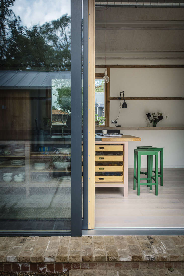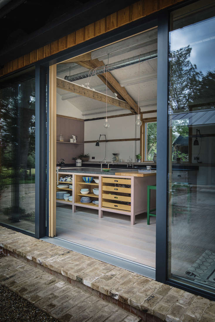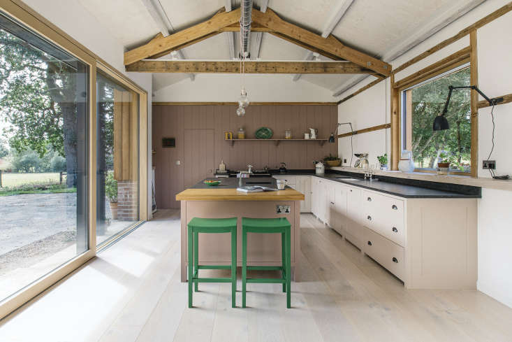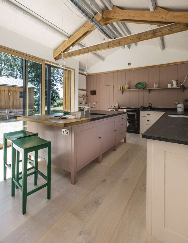 The owner of this Plain English kitchen until recently lived a stone’s throw away, in a farmhouse in rural Suffolk, England, that had been in her husband’s family for nearly a century. Newly widowed and with three children who would soon all be away at university, she decided to downsize without having to uproot: she’s in the process of selling her house to a young family, and has moved with her youngest daughter into new quarters converted from a series of interlocking barns and sheds.