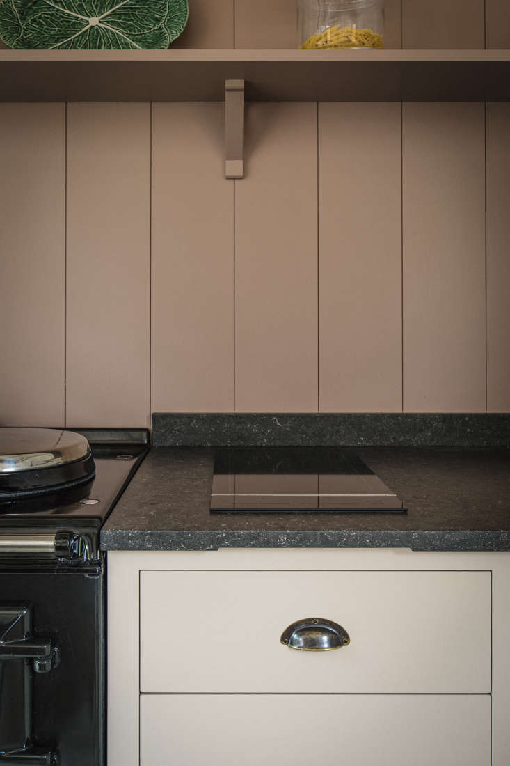 Above: The Fisher & Paykel induction cooktop is big enough for two pans. The Aga has an internal vent for the ovens—the pipe goes to an external wall in the pantry—and there’s a small extractor over the paneling. The owner says she also opens the sliding doors as needed. As for the lack of backsplash, she tells us, “the paint surface is washable and the Aga lids protect the space behind them. The width of the work surface allows the induction hob to sit away from the wall, so not too much splashing to deal with.”