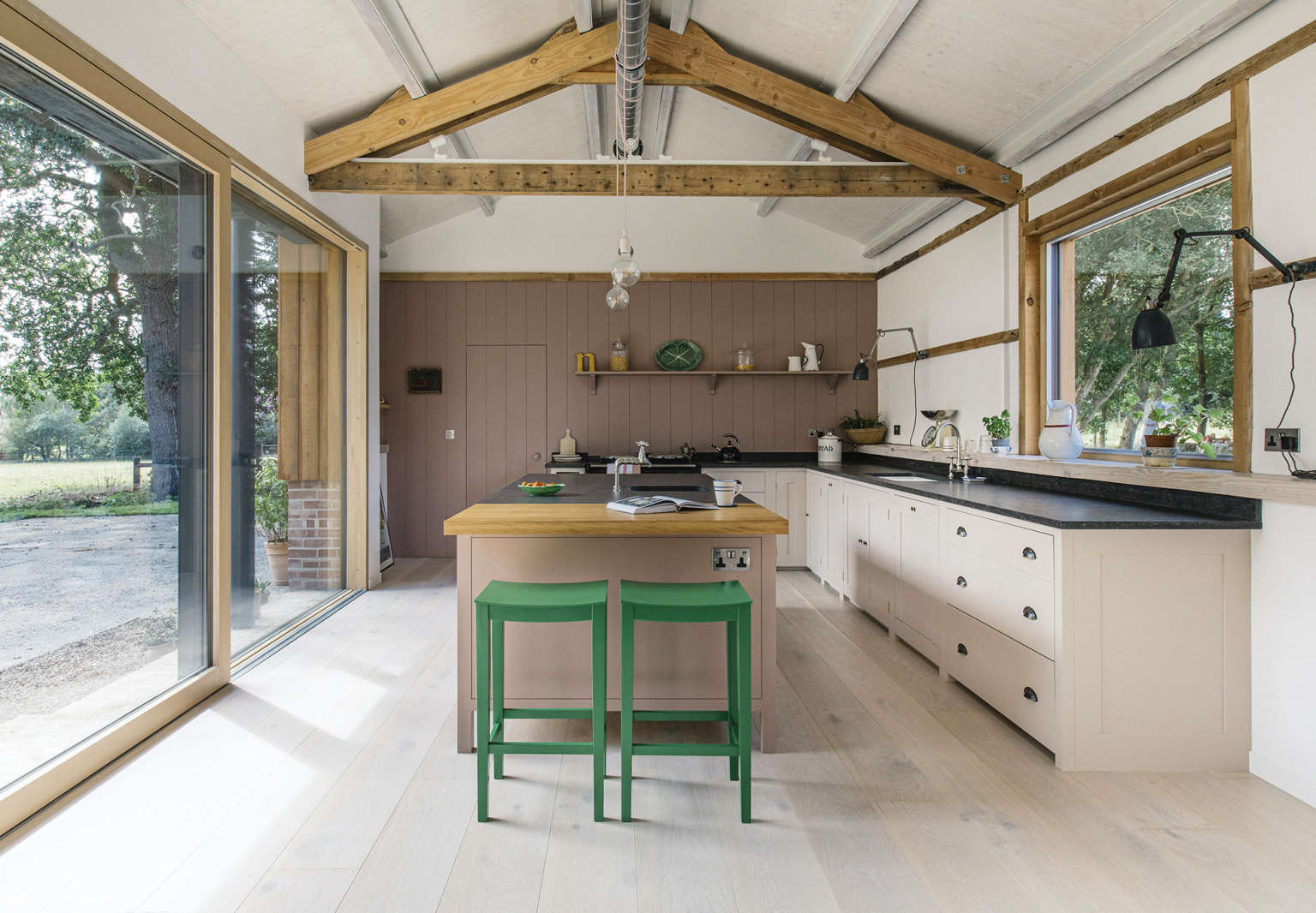Above: The kitchen is housed in a century-old shed that was only a third enclosed—the sliding glass doors were inserted in the formerly open section. The room is approximately 430 square feet with a 14-foot-tall peaked ceiling paneled in birch plywood with exposed piping. The rafters are original–a look Trebilcock continued by framing the windows in old wood.
