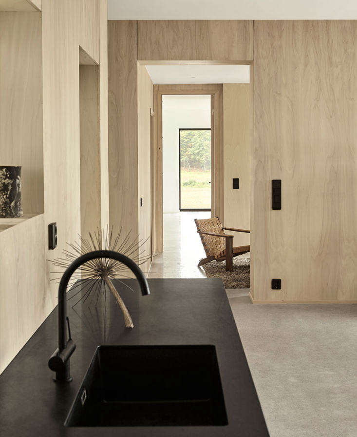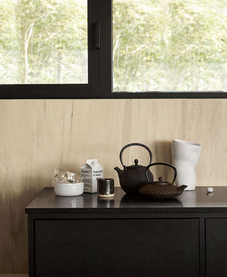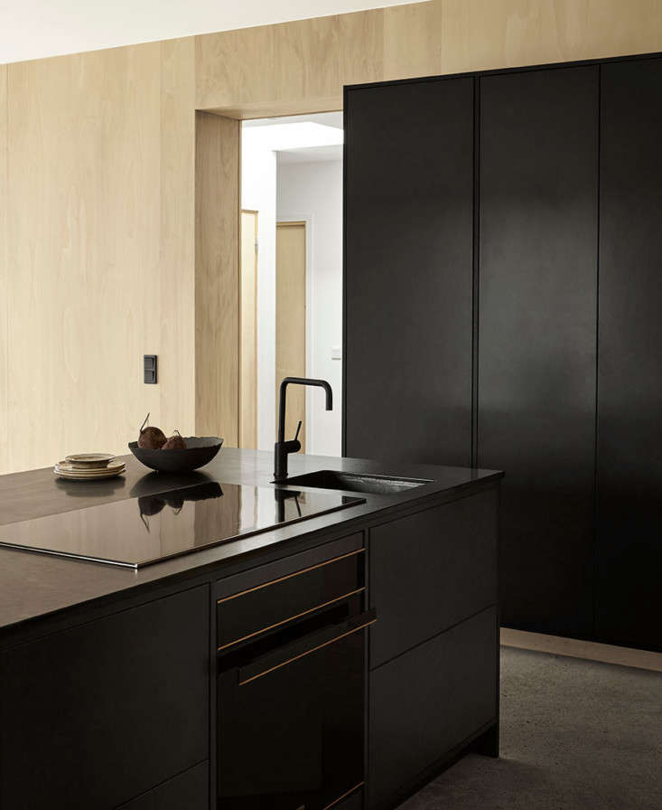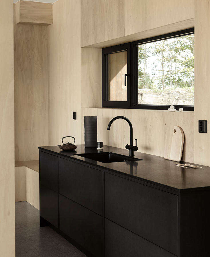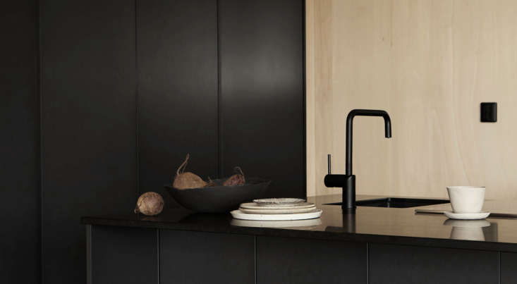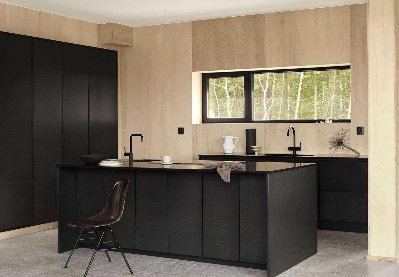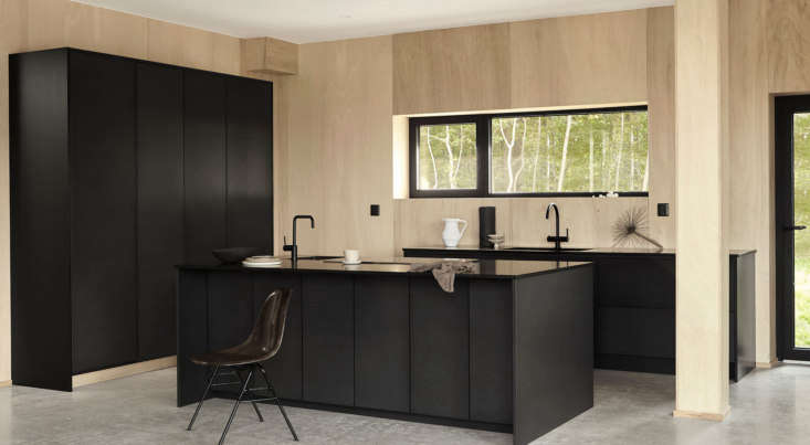 Swedish painter Emma Bernhard‘s kitchen is much like her art: minimalist, bold, honest, with a fondness for black. Known for her large-scale works featuring evocative black brush strokes, Emma collaborated with Nordiska Kök to design the space, choosing the firm’s streamlined Valchromat cabinets for a sleek look that offsets the natural warmth of the home’s pine plywood walls.