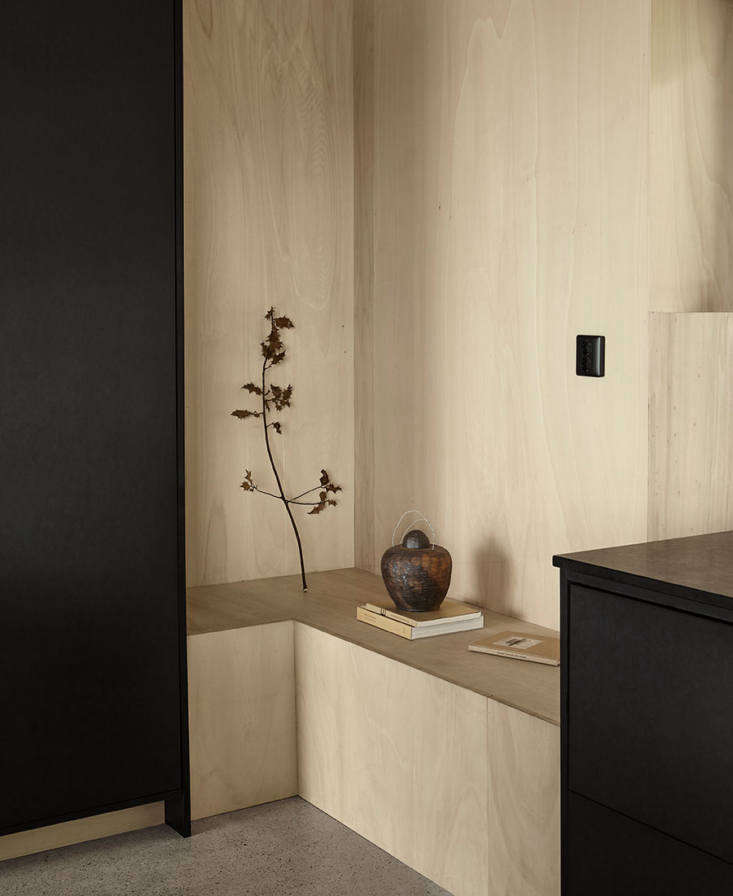 Above: Pine plywood benches blend seamlessly into the walls.,