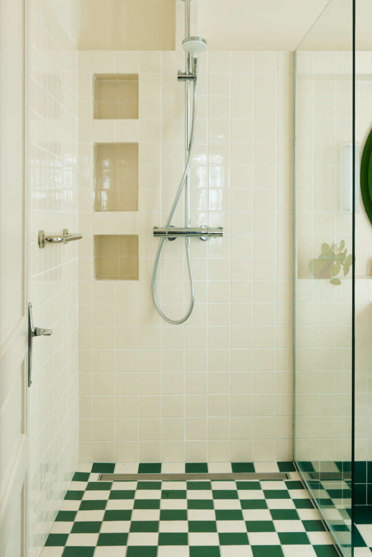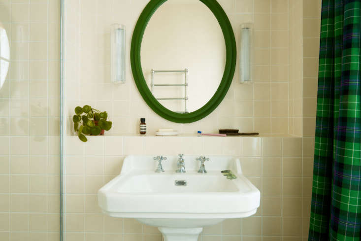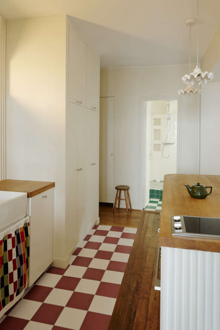 Above: The kitchen’s red checks lead to the bathroom’s green checks. The bespoke cabinets next to the sink are for storing pantry items, appliances, and other things best kept out of sight. The frilly Ceramic Pendant Lights, another grandmotherly chic touch, are by Remodelista favorite Zangra.,