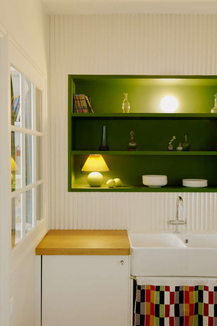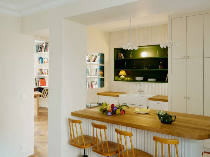 Above: The architects detailed the kitchen with Rombini fluted porcelain tiles designed by Ronan and Erwan Bouroullec for Mutina: “the light and shadows on it beautifully brightens the room and the lines remind us of a grandma doily in a contemporary way,” says Suleïma. (For more like it, see Trend Alert: Fluting in the Kitchen).