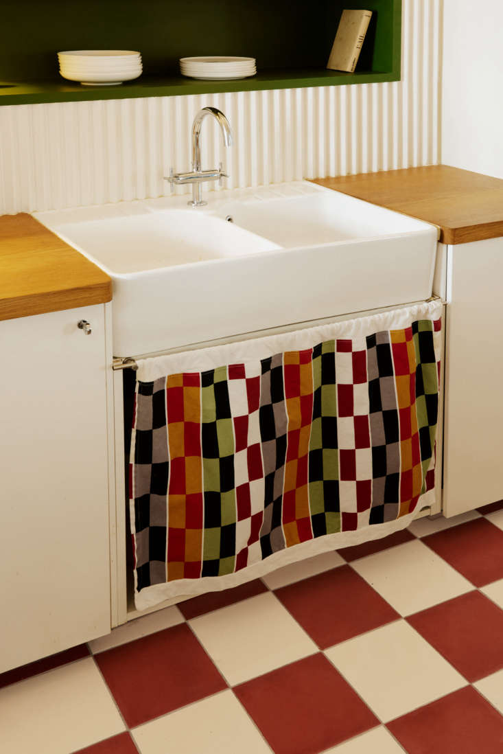 Above: The 2 Bins Sink was an Amazon purchase. To go with the new checked floor, Suleïma found a length of Ikea fabric on Etsy patterned with all of the colors used in the apartment. She had it stitched into a sink curtain to loosen up the space and “introduce a bit of humor: we think design should inspire some emotion.”
