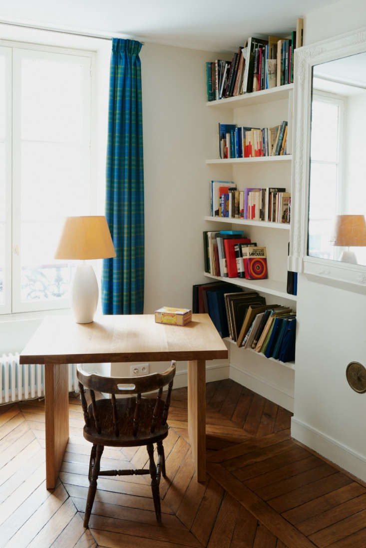 Above: Stephen gave Suleïma and Antoine “carte blanche” to come up with the apartment’s key furnishings. They designed his desk in collaboration with their architecture school friend Baptiste Potier of 127AF: larger than it looks here, it’s made of oak that was leftover from the kitchen counters and overlooks the street.