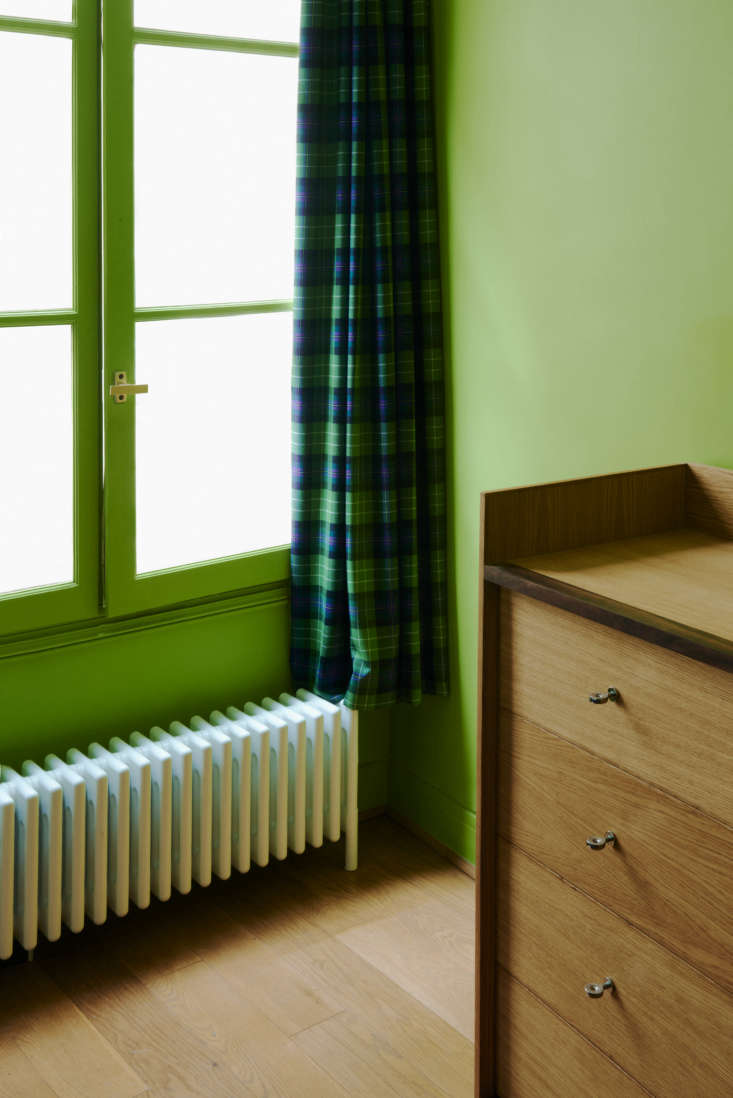The architects applied a rigorous assessment of the 55 square meters (less than 600 square feet), and suggested flipping the locations of the bathroom and kitchen to open up the latter to the living space and give each a fresh guise. As a rescue measure, they recommended built-in storage (scroll to the end for a glimpse of the mess that was). And, as a finishing touch, they prescribed joie-de-vivre: checks and plaids for every room, a wink to both the 18th-century building’s rustic history and Stephen’s Irish origins. Stephen himself took the theme to the next level insisting that his entire bedroom be green.