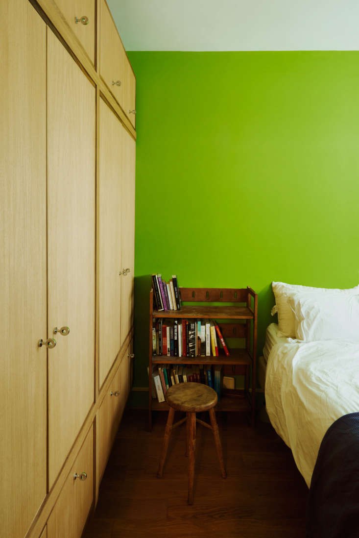 Above: The bedroom, formerly a minty green, is now a bright apple. “My family and friends tease me endlessly about my Saint Patrick’s Day room,” says Stephen who insists he finds the color restful.